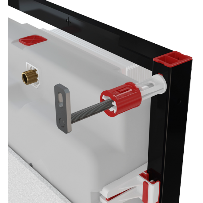 - Rėmas leidžia pritvirtinti prie atskiros pakankamai tvirtos gipso kartono pertvaros, priešais laikančiąją sieną
