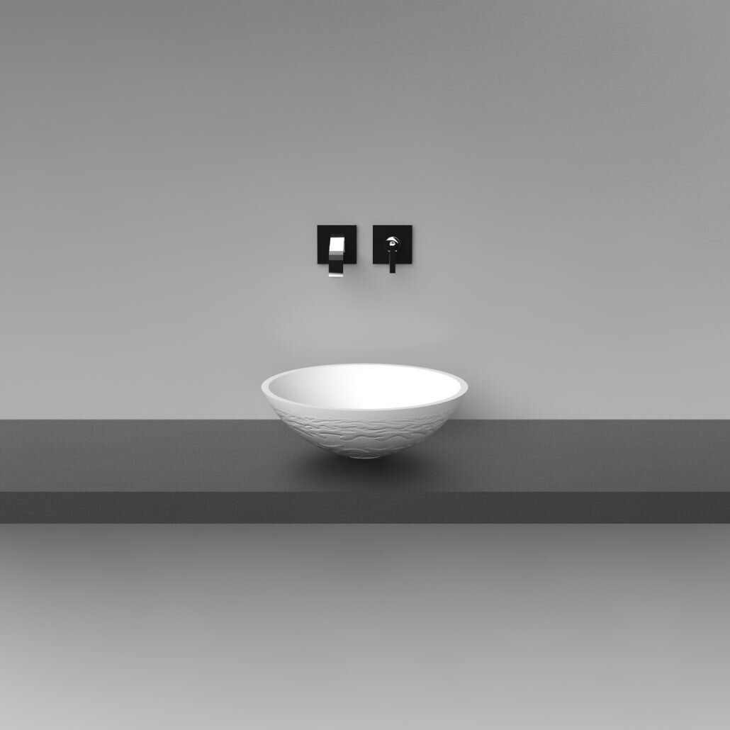 Akmens masės praustuvas su blizgiu paviršiumi.